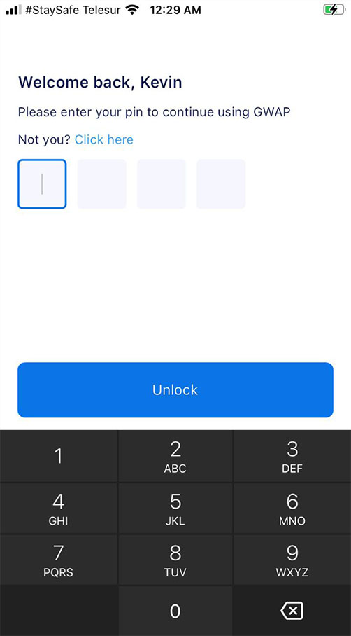 You can set a PIN code for added account security. If you select "Not Me" on the PIN screen, you'll be signed out and redirected to the main login screen where you'll need to provide your phone number and password for reauthentication.